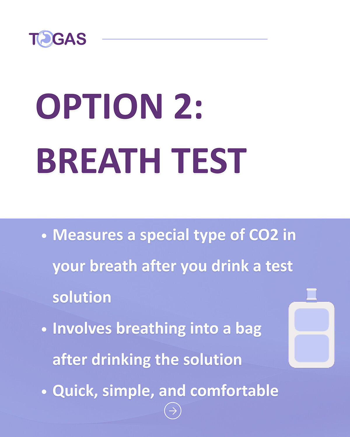 This quick and comfortable test measures the amount of carbon dioxide in your breath. You'll drink a special solution containing urea, then breathe into a bag. If H. pylori is present in your stomach, it breaks down the urea, releasing CO2 that can be detected in your breath. The entire process takes about 30 minutes and is highly accurate for detecting active infections.